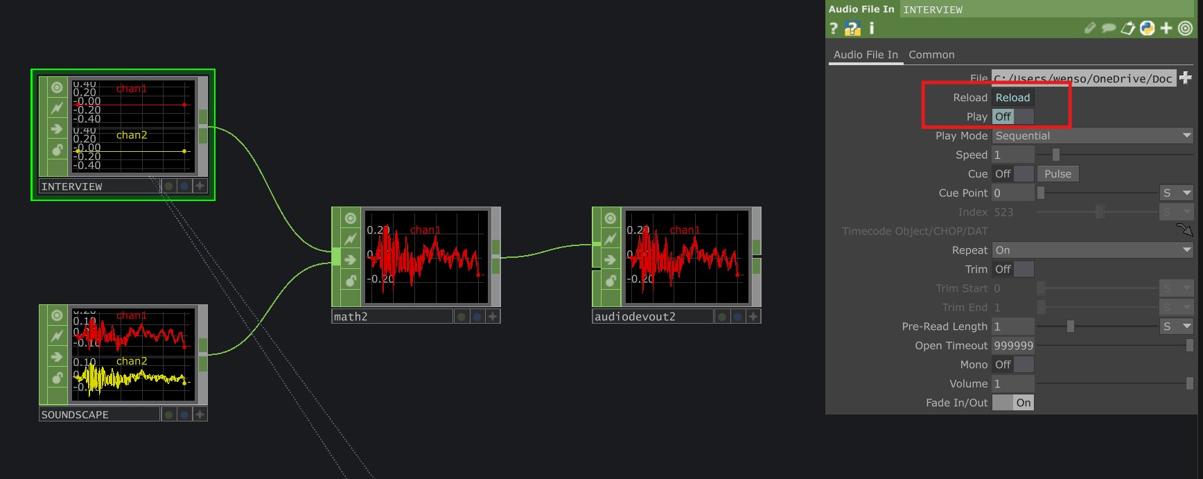 To create the experience where touching the rattan triggers the interview audio to play as well as the visual change in the photograph, I used a plugin called MediaPipe that registers hand data. I directed the plugin to just detect the full hand and for it to generate a change in value when a hand is detected. I positioned the camera to frame the rattan tightly, and mapped the hand detection range to be within the area of the rattan. The change of value when hand is detected is used to trigger the saturated image to overlay the B&W image and to also trigger the audio interview, giving the illusion that the image is coming to life.