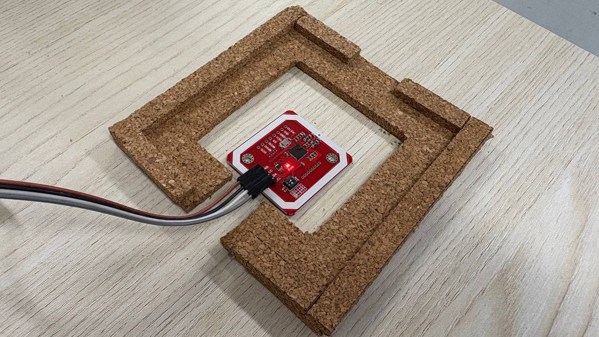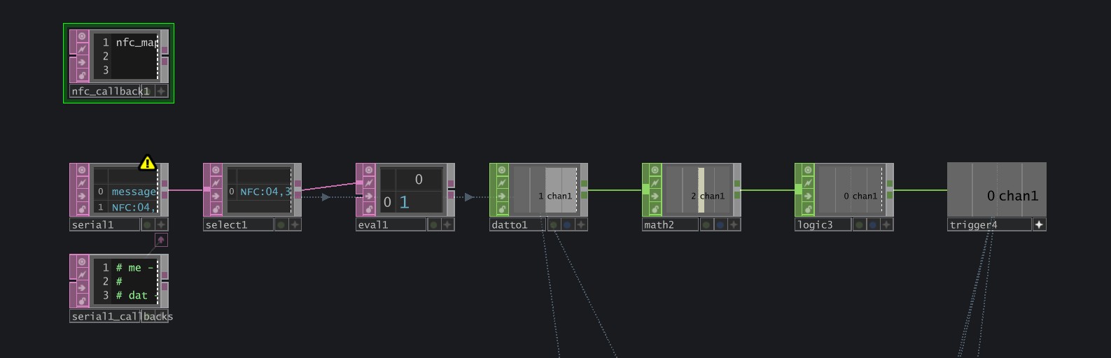 A NFC chip is planted below both physical texture boards, with their own respective data written. When this is placed above the NFC sensor within the texture holder, it sends the written chip data to TouchDesigner, which is then used to trigger the visual and audio changes.