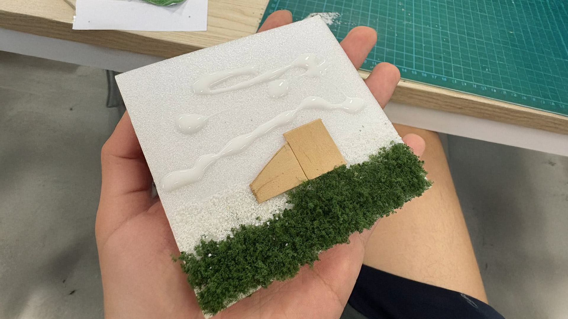 To start off, I bought some fake grass/greenery and ice cream stick to simulate the textures within the photo i took in the park. Due to budget constraints, I was working with cheaper materials (otherwise would have chosen a more suitable material for the leaf texture). I then cut out a square foam tile, overlayed it with reference image and used a inkless pen to leave a indent to mark the positioning of the textures on the foam tile below. Lastly, I glued the textures into place. I used ice cream sticks instead of wood due to accessibility (otherwise need a wood saw).