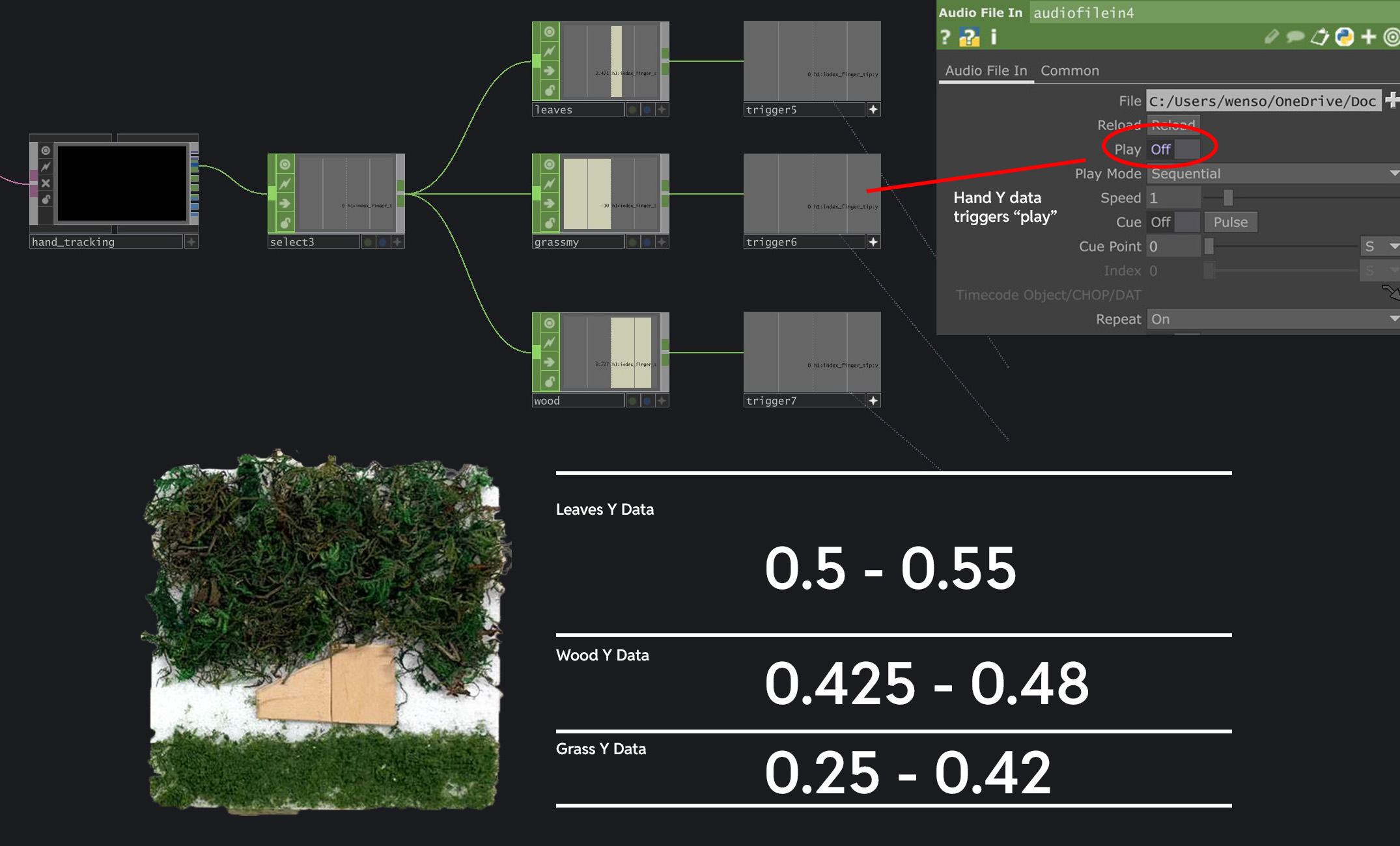 To create the interactivity aspect of this experiment, I used Mediapipe to track the fingertip position Y data, which basically measures where my fingertip is at along the Y axis. Since my physical texture tile can be segmented into 3 different segments along its height, I tested and noted down the Y data ranges for each segment. For example, the grass has a Y data range of 0.25 - 0.42. Since the wooden bench is higher than the grass, the Y data range is 0.425 - 0.48. Another important detail was for me to also constrain the interaction within the width (X data) of the tile because I only want the sounds to play when the touch is within the tile's area. To do this, I mapped the fingertip X data to the width of the tile and only when the fingertip is within this range will the volume of the audio be set to 1 (otherwise its 0 and muted).